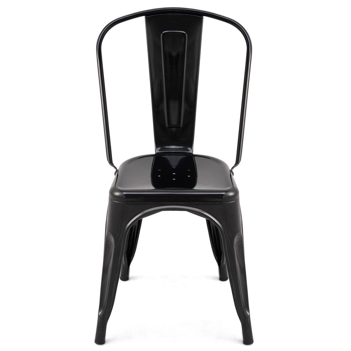 A classic touch is added to your kitchen decor with this Set of 4 Indoor Outdoor Black Metal Stacking Bistro Dining Chairs. Each chair features a high back which offers durable support needed down the center of your spine to help guard against fatigue and aches. Simple and practical, you can apply the set of chair into anywhere you can imagine, such as bistro, living room, dining room and your kitchen.