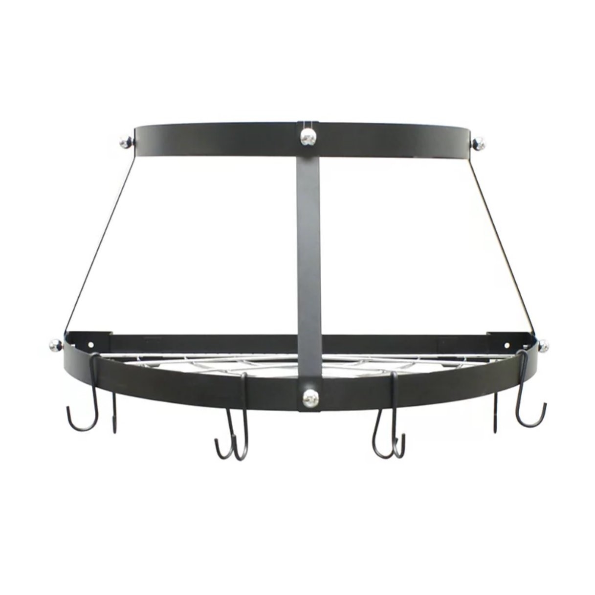 Arrange your cookware and utensils with this Modern Wall Mounted Enameled Double Shelf Pot Rack in Black. Easily access your hanging cookware and utensils with this wall-mounted rack! This attractive pot rack features upper shelf and repositionable hooks to maximize your space. You can hang over the stovetop, sink, kitchen island or any other desired area in your kitchen. Maximize your space with this stylish hanging rack, as seen in designer home magazines! Easy to assemble and install, the Black Enameled Wall-Mounted Pot Rack comes with complete hardware for installation.